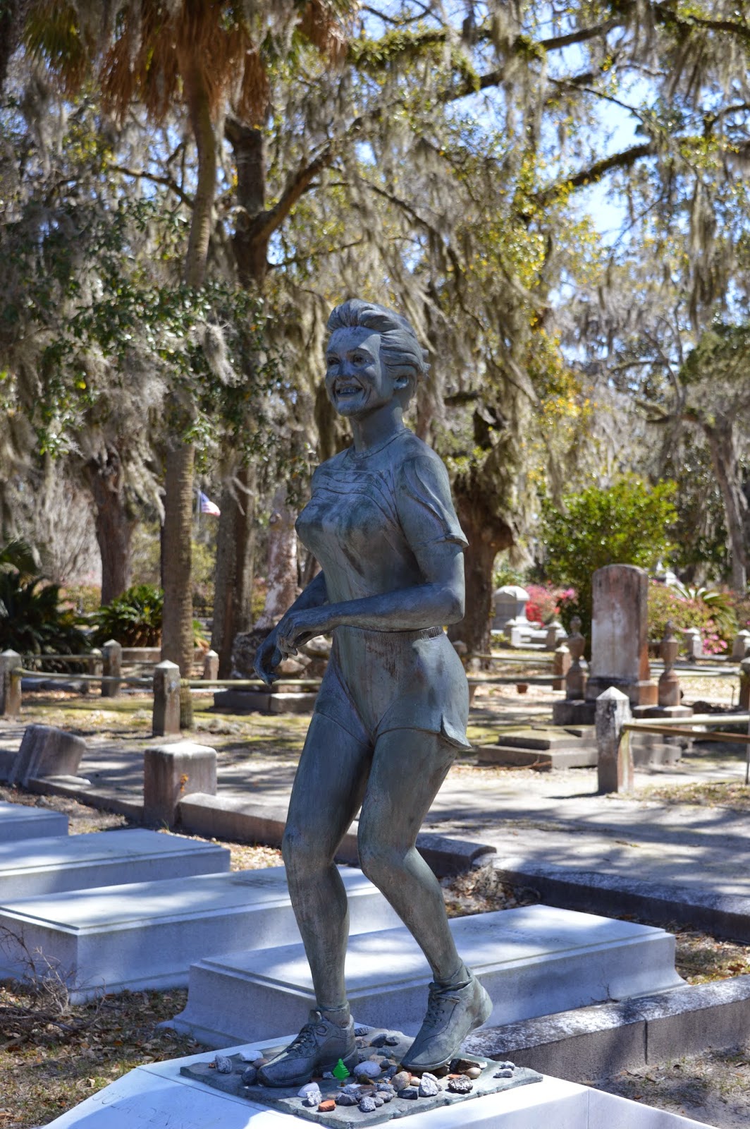 The statue to the right is of a woman running. The lady who is buried here was a marathon runner. Each year there is a marathon in Savannah and they stop at Bonaventure to visit this running woman and light candles in her honor.